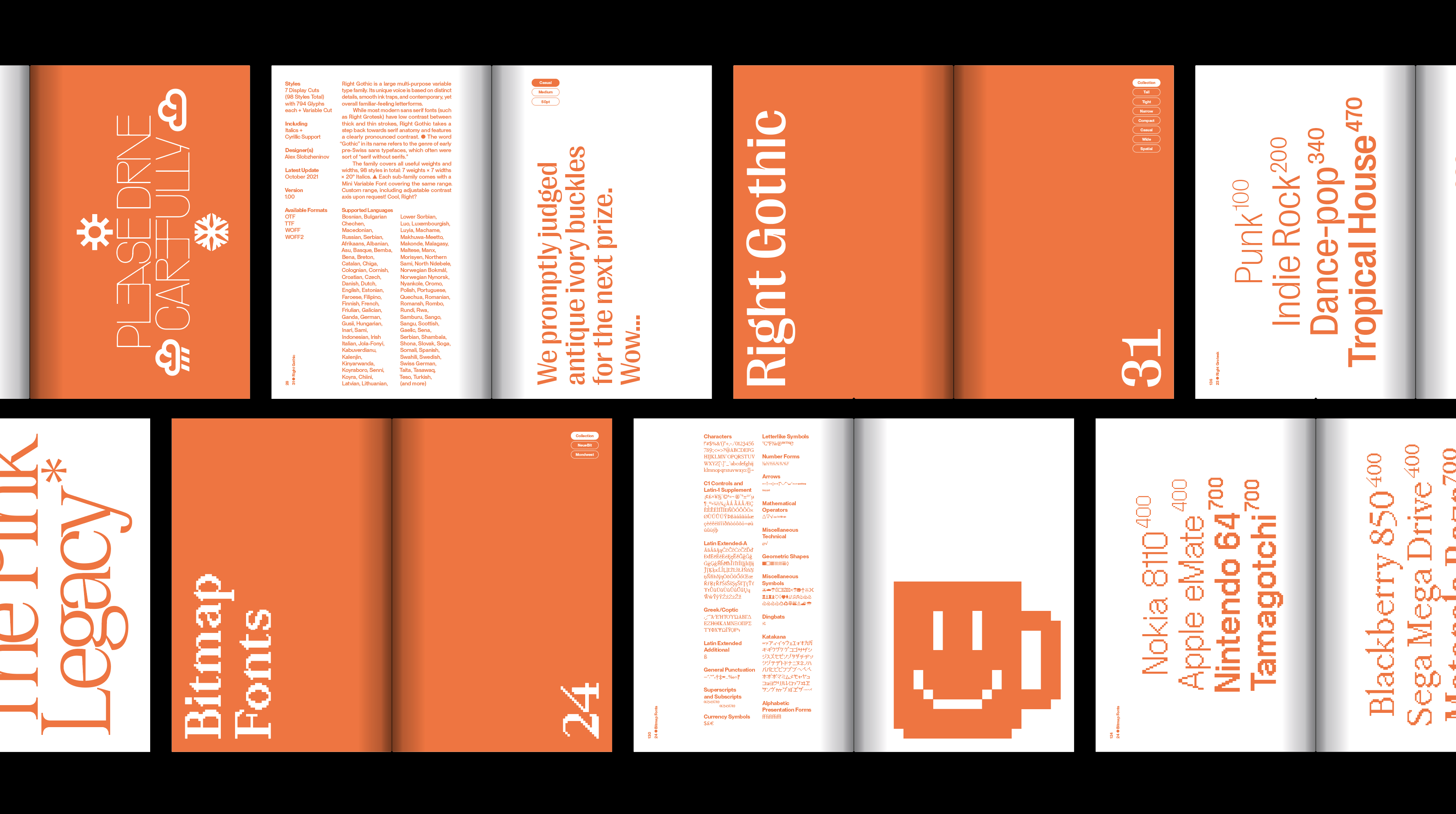 The idea behind the design of the PP32 Specimen Book was to recreate the sort of catalogs old foundries’ salesmen used to carry around to sell fonts to clients and ad agencies. We wanted to create a well made, stocky object with an undeniable presence. Following a beautifully functional grid system, the book allows the reader to compare the specs of each typeface whilst also containing more expressive pages that break the grid to play with the varying styles and weights.